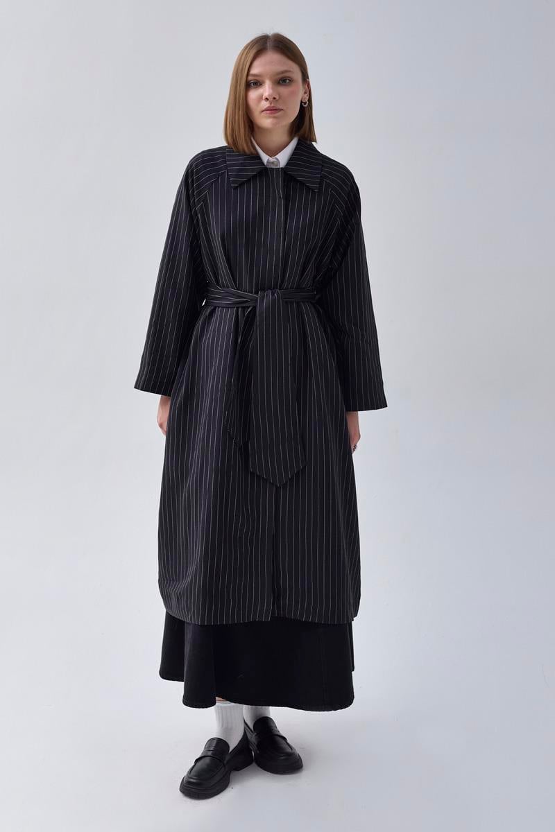 Çizgi Desenli Trençkot Siyah, zamansız şıklığıyla günlük ve özel kombinlerde rahatlıkla kullanılabilir. Dikey çizgi deseni ile uzun ve zarif bir siluet sunarken, kuşaklı tasarımı sayesinde belinizi vurgular ve farklı bağlama stilleriyle çok yönlü bir kullanım sağlar. Hem klasik hem de modern görünümlere uyum sağlayan bu trençkot, gardırobunuzun vazgeçilmez parçalarından biri olacaktır.