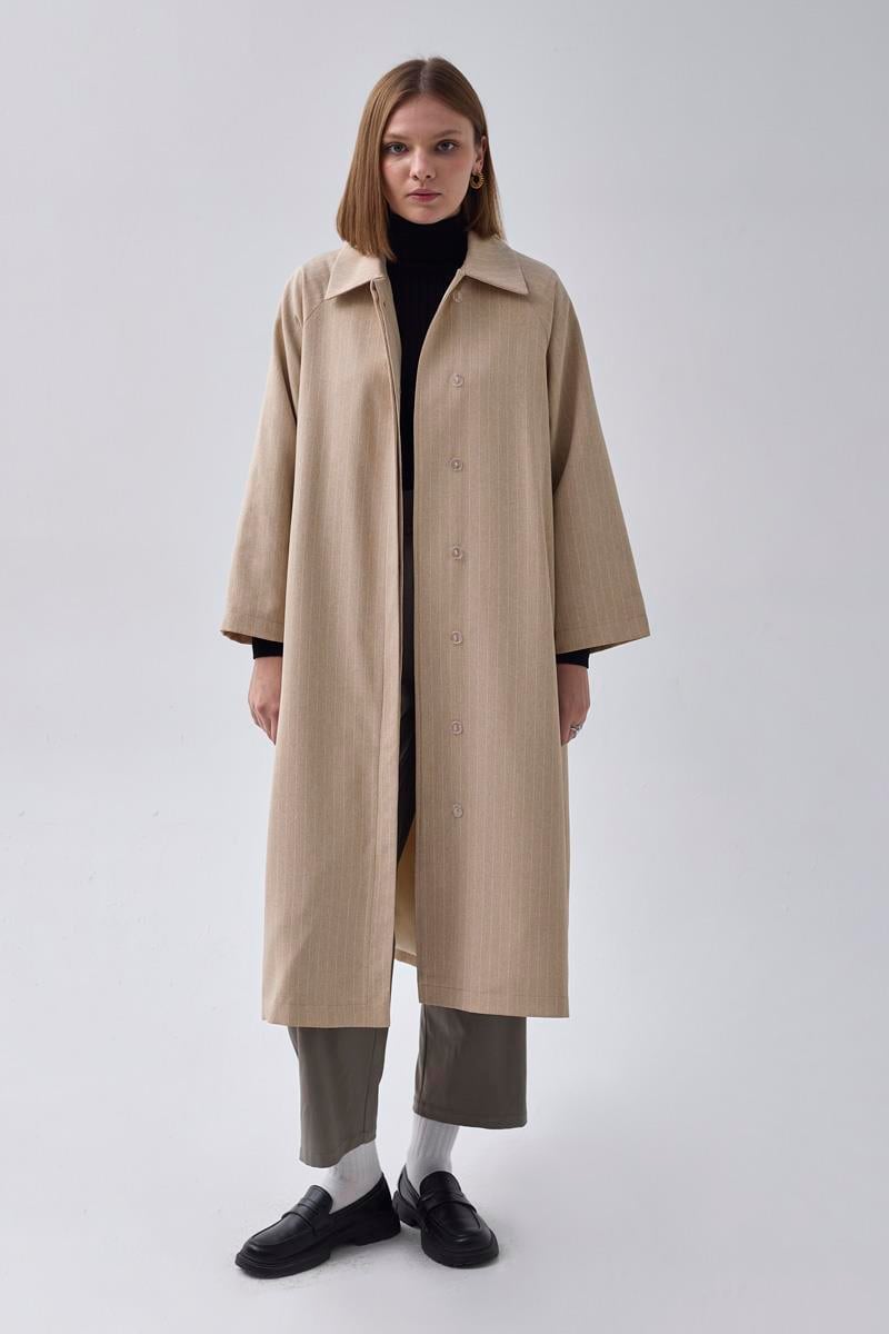 Çizgi Desenli Trençkot Taş, zamansız şıklığıyla günlük ve özel kombinlerde rahatlıkla kullanılabilir. Dikey çizgi deseni ile uzun ve zarif bir siluet sunarken, kuşaklı tasarımı sayesinde belinizi vurgular ve farklı bağlama stilleriyle çok yönlü bir kullanım sağlar. Hem klasik hem de modern görünümlere uyum sağlayan bu trençkot, gardırobunuzun vazgeçilmez parçalarından biri olacaktır.