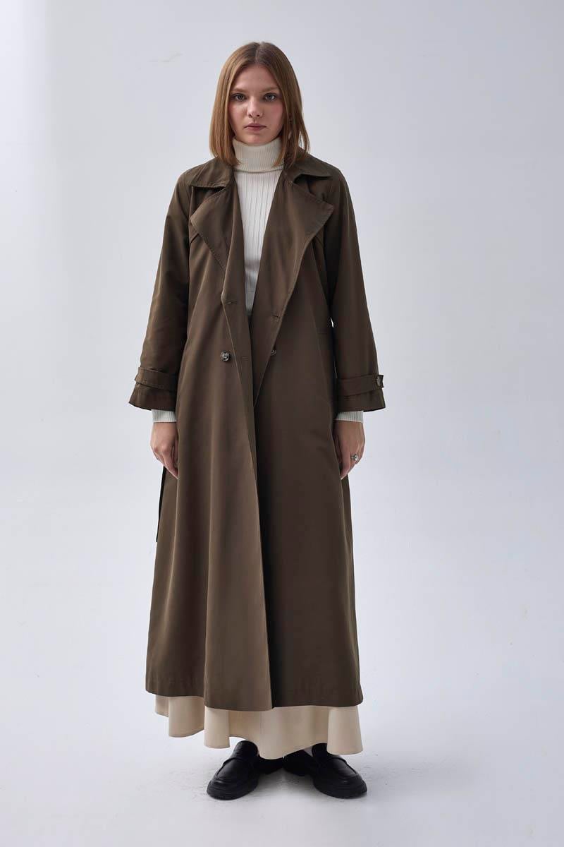Kruvaze Klasik Trençkot Koyu Haki, zamansız tasarımıyla her kombine uyum sağlayan şık bir dış giyim parçasıdır. Kruvaze yaka detayı, önden düğmeli formu ve uzun boyuyla klasik bir şıklık sunar. Günlük şehir stilinde veya özel günlerde rahatlıkla tercih edilebilir. Astarlı yapısı sayesinde konforlu kullanım sağlar.